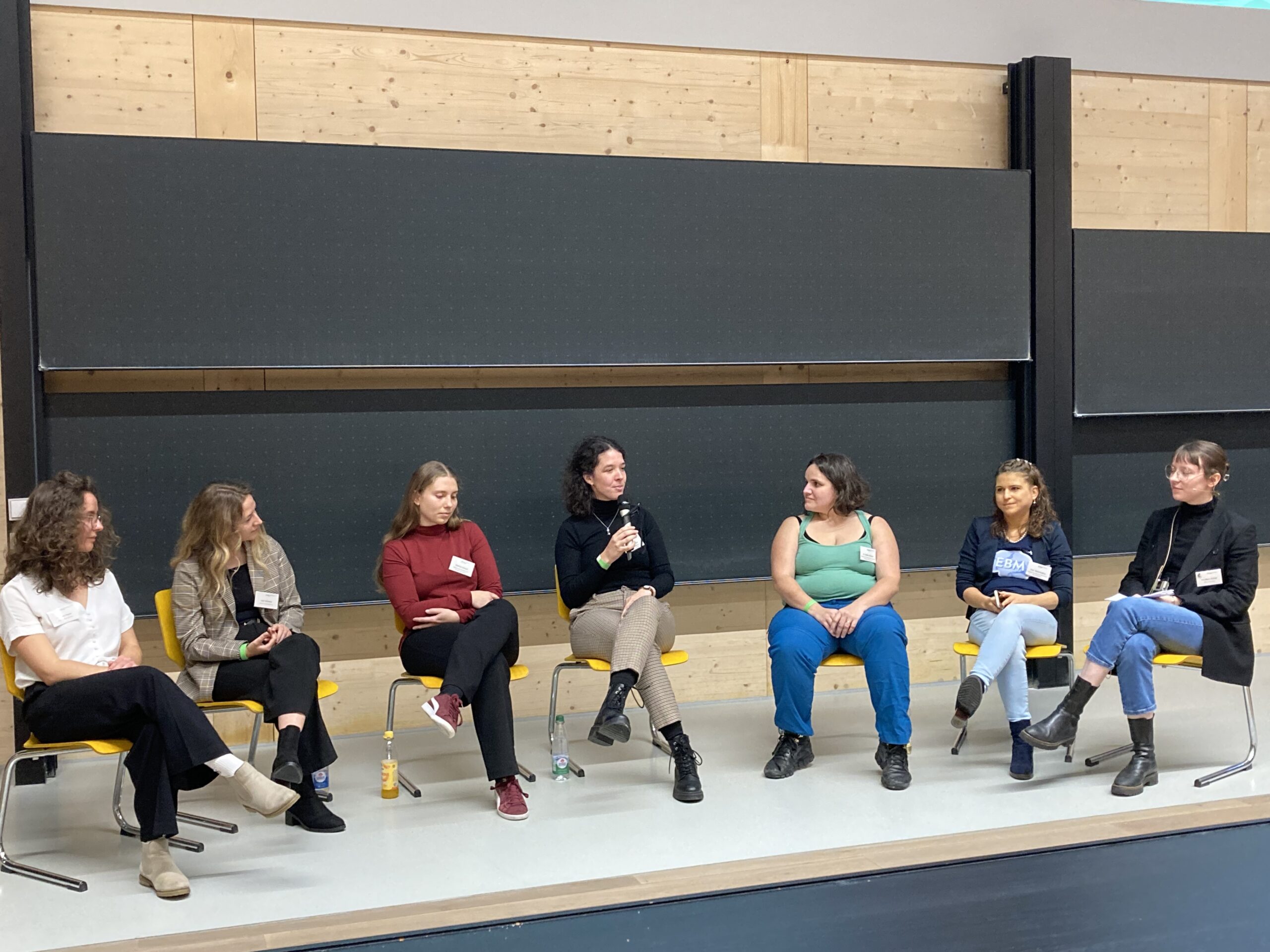 Zu diesem Zweck lud Eva Studentinnen, Doktorandinnen und Postdoktorandinnen sowie Professorinnen ein, um über ihre unterschiedlichen Erfahrungen auf den verschiedenen Stufen ihrer Karriere zu sprechen (Marlene Ziegler, Julia Wimmer, Patricia Schmul, Katharina Braun, Dr. Sabine Thürauf, Dr.-Ing. Silvia Budday, Elisa Neuß, Viktoria Cichocka). Besonders beeindruckend war der Bericht unserer jüngsten Podiumsteilnehmerin (7 Jahre alt) über die Fördermittel, die sie für zwei wissenschaftliche Projekte erhalten hat, eines für Kinder im Kindergartenalter und das andere für ein Projekt im Rahmen der „Kinderuniversität“ im Bereich Elektrotechnik.